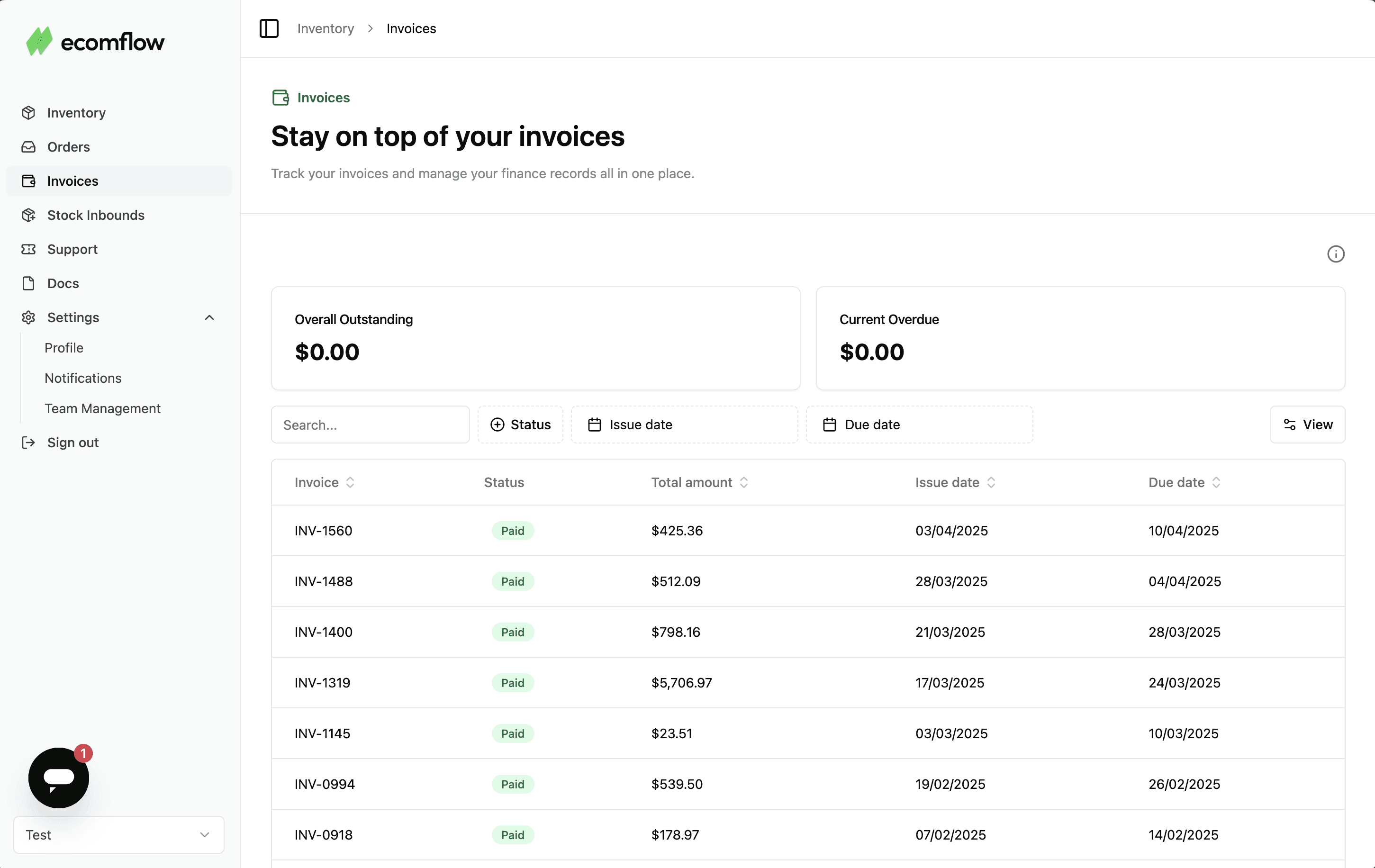 View all Ecomflow invoices in a single, clean dashboard