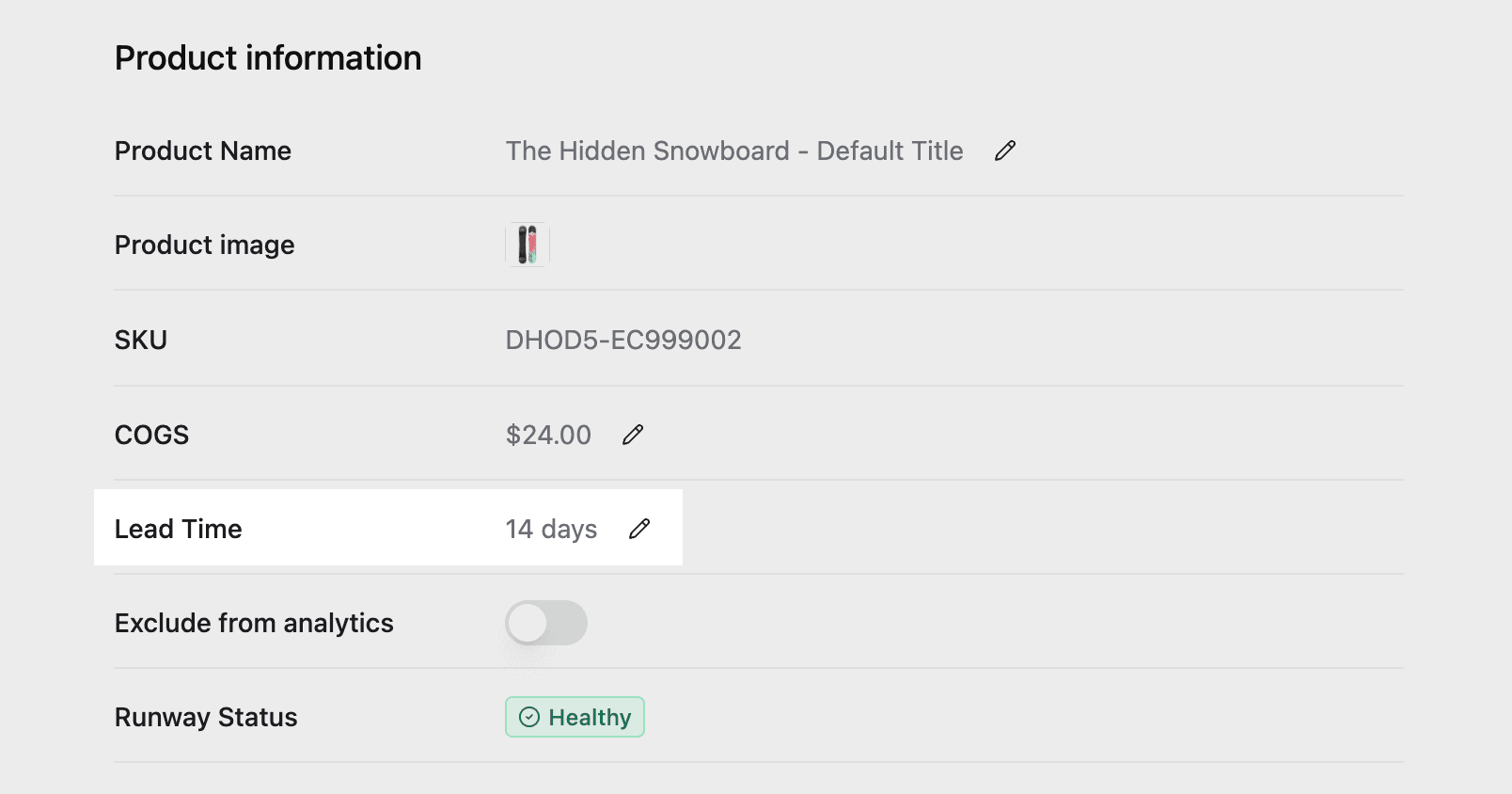 Set up lead times for each product in your inventory to generate accurate runway forecasts.