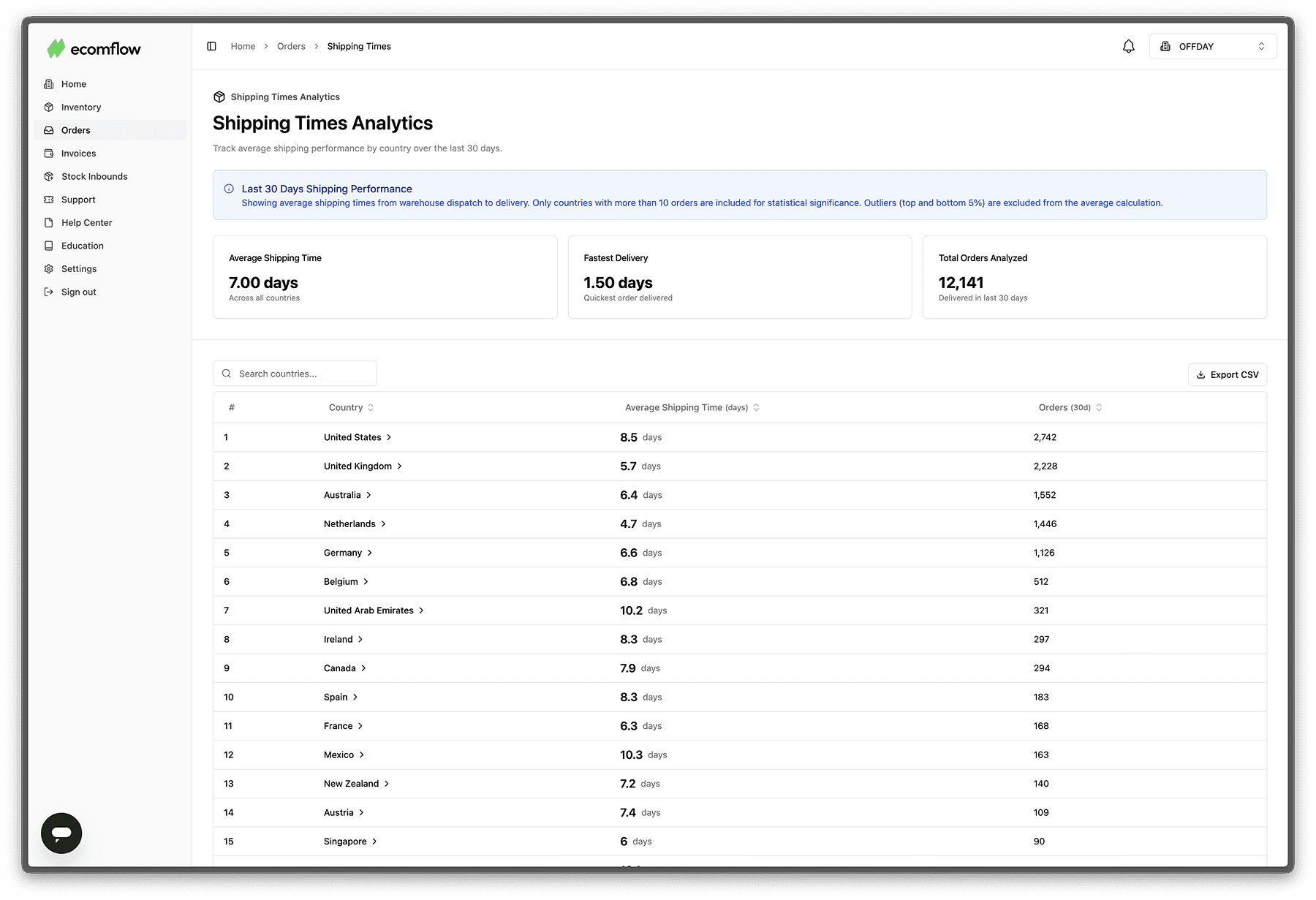 Understand how delivery speed varies by country. Countries are included in the breakdown when they have a minimum of 10 orders in the past 30 days, ensuring the data you see is statistically meaningful rather than based on isolated shipments.