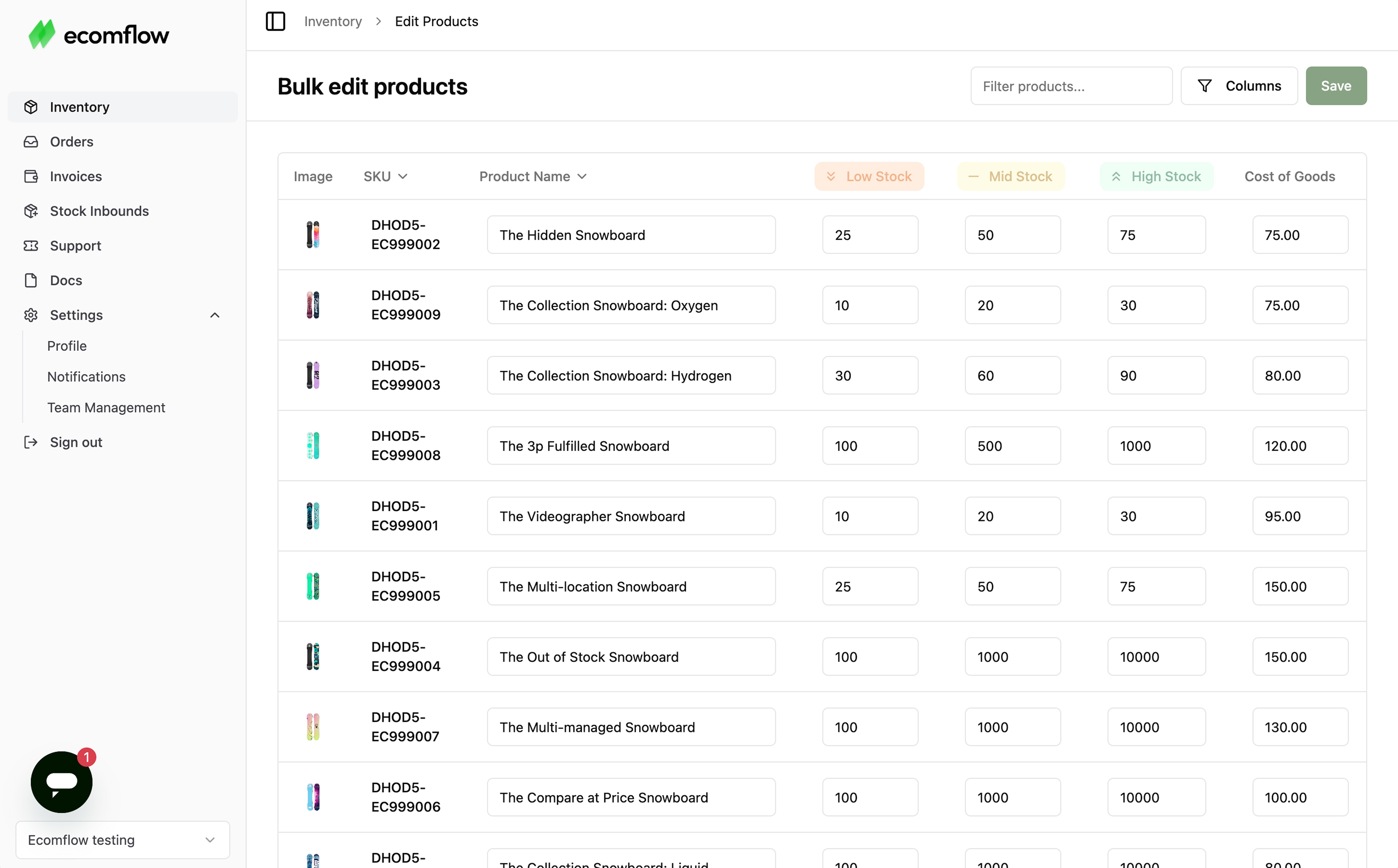 Bulk edit SKUs with product names, COGS, incoming inventory, and thresholds.